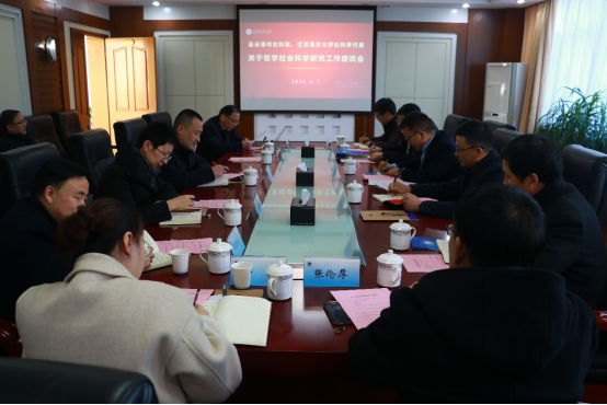 3月2日下午,江苏省连云港市哲学社会科学界联合会党组书记、主席张国桥一行5人来我校调研交流。社科处处长宣昌勇在行政楼二楼会议室主持召开座谈会。商学院、文法学院、外国语学院、艺术学院、体育学院以及社科处全体人员等人文社科学院领导出席调研座谈会。